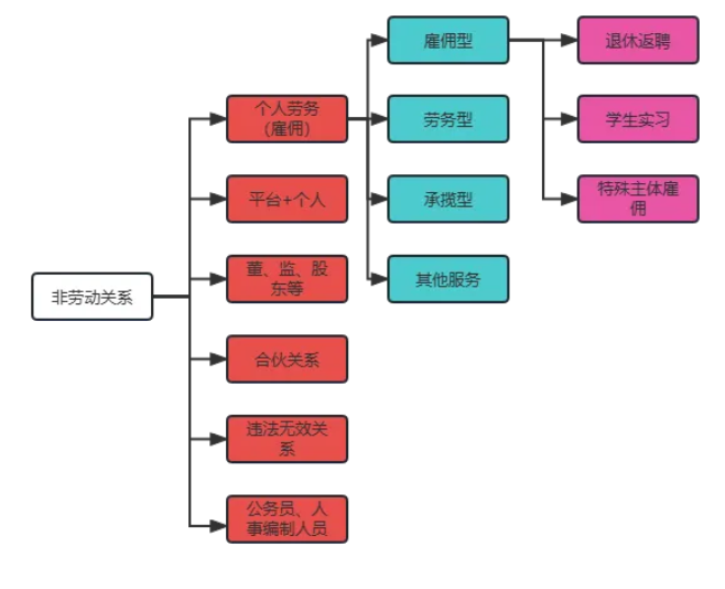 四类较容易判断的“非劳动关系”1、主体不符合的用工雇佣关系下,雇员其实就像员工一样上班,但因其中至少有一方不符合劳动法的主体特性,因此不构成劳动关系。分为两类: